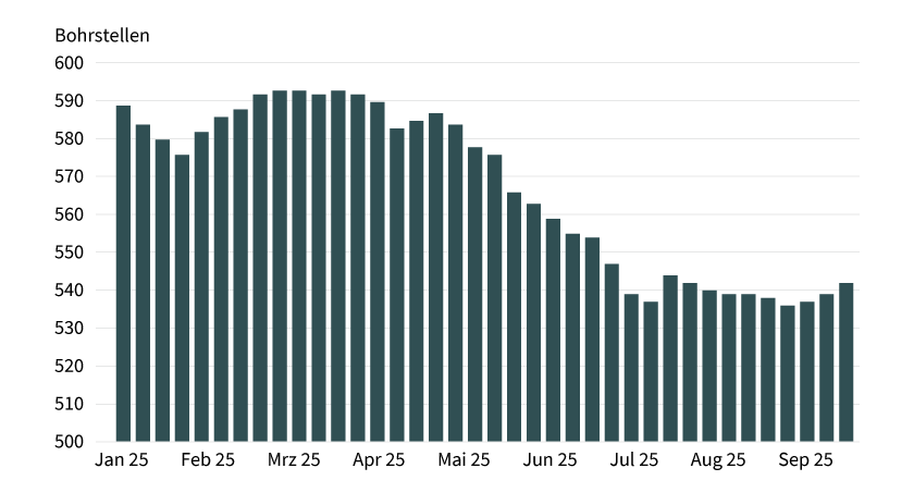 Ein Blick in die Produktionsstatistik erweckt nicht gerade den Eindruck, als sei das Motto »Drill, baby, drill!« im Energiesektor angekommen. Baker Hughes zählt regelmässig die in den Staaten aktiven Öl- und Gasentnahmestellen. Mitte September 2025 brachte der Ölfelddienstleister 542 sogenannte Rigs zusammen. Das waren knapp 6 Prozent weniger als zum Zeitpunkt von Trumps Vereidigung im Januar (siehe Grafik 1). Unter anderem in der wichtigen Schiefergasregion Permian, die sich über Westtexas und den Südosten von New Mexico erstreckt, fahren die Unternehmen ihre Investitionen zurück. In Summe fördern die USA dennoch so viel Rohöl wie nie. Die U.S. Energy Information Administration geht davon aus, dass die tägliche Produktion im laufenden Jahr 13,44 Millionen Barrel erreichen wird. Erst im kommenden Jahr soll sich die rückläufige Bohraktivität auf die Liefermengen auswirken. Die EIA rechnet für 2026 mit einem leichten Rückgang der US-Ölproduktion. Was allerdings nichts daran ändert, dass die US-Energiebehörde für den Weltmarkt eine Überversorgung prognostiziert.