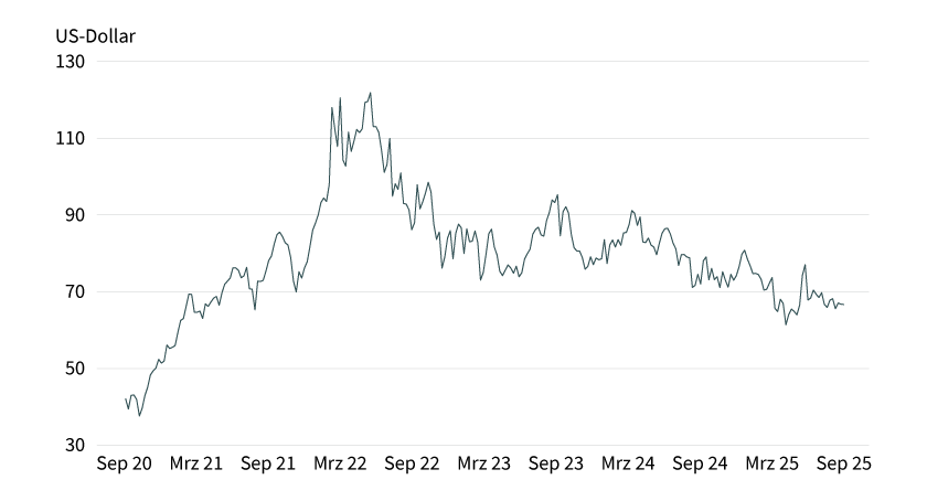 »Sofern sich die geopolitische Lage aber nicht weiter anspannt, drohen die Ölpreise aufgrund der Überversorgung unter Druck zu geraten«, lautet das Fazit von Commerzbank Research. Konkret taxieren die Analysten den Preis für 1 Barrel der Nordseegattung Brent per Ende des Jahres auf 65 US-Dollar. Die Prognose für 2026 wurde gerade auf dasselbe Niveau gekürzt. Behalten die Experten recht, würde sich der Energieträger bis auf Weiteres seitwärts bewegen. Was allerdings nicht heissen muss, dass es zwischenzeitlich zu stärkeren Ausschlägen kommt. In den ersten knapp drei Quartalen 2025 zeigte Brent eine historische Volatilität von rund 25 Prozent. Damit hat der Future deutlich stärkere Schwankungen erlebt als die Aktienindizes SMI, DAX und S&P 500.