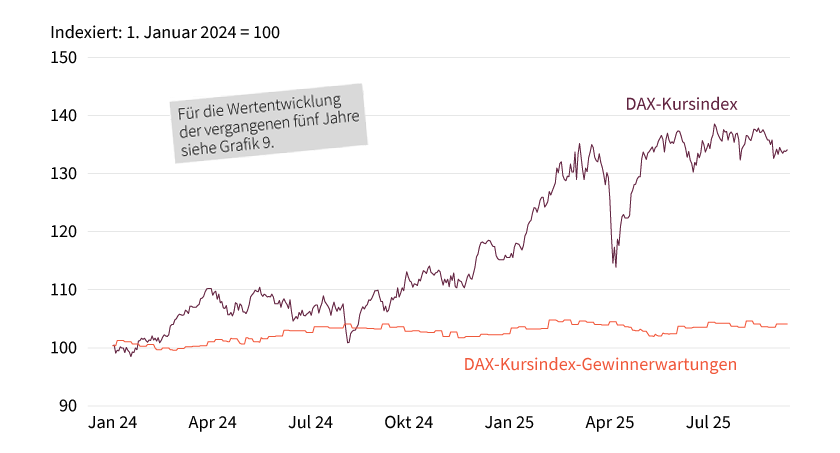Grafik 1: DAX-Kursindex steigt seit Anfang 2024 um 34 Prozent, während Gewinntrend um 4 Prozent zulegt