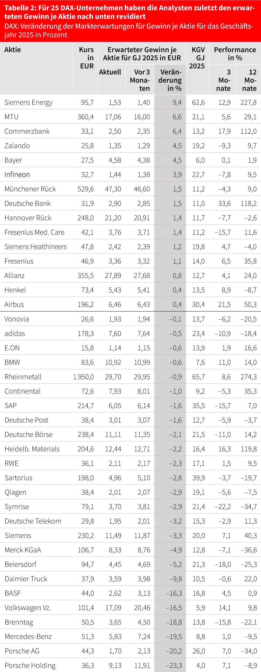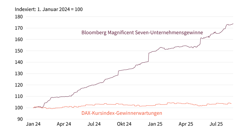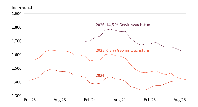 Zudem wird es wichtig sein, ob die recht drastischen negativen Gewinnrevisionen im Auto- und Chemiesektor aufgrund der besseren Konjunkturperspektiven für 2026 bald auslaufen. Doch in beiden Sektoren herrscht wohl auch 2026 ein enormer Wettbewerbsdruck, beispielsweise im Autosektor durch die Konkurrenz aus China im Markt für Elektroautos. Aufgrund der genannten Risikofaktoren sind die von den Analysten erwarteten 14 Prozent DAX-Gewinnwachstum für 2026 wohl zu ambitioniert, aber ein Wachstum von 6 bis 8 Prozent halten wir für realistisch.
