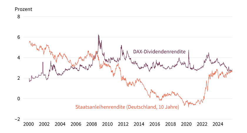 Die DAX-Rally von 34 Prozent seit Anfang 2024 steht fundamental auf wackligen Beinen. Denn die DAX-Unternehmensgewinne und die DAX-Dividendensumme treten – ähnlich wie die deutsche Wirtschaft – seit mehreren Jahren auf der Stelle. Doch die acht Leitzinssenkungen der EZB, die wohl anstehenden weiteren Leitzinssenkungen der US-Notenbank und die deutlich höheren Ausgaben des deutschen Staates sprechen dafür, dass 2026 nicht nur die deutsche Wirtschaft, sondern auch die Gewinne der DAX-Unternehmen wieder spürbar wachsen werden. Wir empfehlen daher Investoren, DAX-Positionen trotz der mittlerweile recht hohen Bewertung zu halten und Positionen eventuell in schwächeren Marktphasen, beispielsweise ausgelöst durch die anhaltend hohe politische Unsicherheit in den USA, nochmals schrittweise aufzustocken.