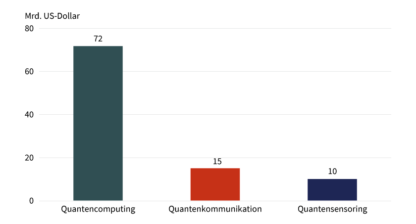Diese wachsenden Fähigkeiten wecken enorme wirtschaftliche Erwartungen. Nach Schätzungen von McKinsey könnten die drei Kernsäulen der Quantentechnologie (QT), Quantencomputing, -kommunikation und -sensoring, bis 2035 zusammen einen Umsatz von bis zu 97 Milliarden US-Dollar erzielen. Dabei wird das Quantencomputing den Grossteil dieses Umsatzes erfassen und von 4 Milliarden US-Dollar im Jahr 2024 auf bis zu 72 Milliarden US-Dollar im Jahr 2035 steigen (siehe Grafik 1). Zwar wird sich QT auf viele Branchen auswirken, allerdings gehen die Experten davon aus, dass die Chemie-, Bio-, Finanz- und Mobilitätsbranchen den Prognosen zufolge das grösste Wachstum verzeichnen werden. Bis 2040 ist laut McKinsey dann noch einmal eine Verdoppelung des gesamten QT-Markts auf 198 Milliarden US-Dollar möglich. Aus heutiger Sicht entspricht das durchschnittlichen Wachstumsraten in den kommenden Jahren von rund 27 Prozent, was das Quantum Computing zu einem der am schnellsten wachsenden Technologiemärkte machen würde.