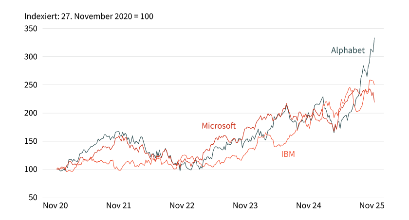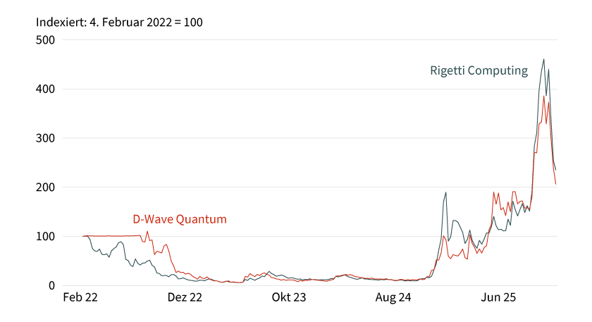 Die Kursverläufe der jungen Quanten-Spezialisten zeigen, dass Anleger ein strapazierfähiges Nervenkostüm brauchen. Nach einem Husarenritt der D-Wave-Aktie zwischen Januar und Mitte Oktober, in dem der Kurs sich mehr als verfünffachte, kam es nun zu einer scharfen Gegenbewegung. Der Titel gab innerhalb von rund vier Wochen um die Hälfte nach. Noch ausgeprägter war das Auf und Ab bei Rigetti (siehe Grafik 4). Die grossen Tech-Player, die sich ebenfalls in der QT bewegen, weisen dagegen deutlich geringere Ausschläge auf. Investments in etablierte Konzerne mit Quantum-Aktivitäten wie Alphabet & Co. bieten eine gewisse Absicherung, da diese Unternehmen noch über andere profitable Geschäftsbereiche verfügen. Trotz aller Unwägbarkeiten, welche Technologie sich letztlich durchsetzen wird und wann bahnbrechende Anwendungen real werden, hat die Quantenrevolution begonnen. Der Durchbruch wird nicht sofort, sondern Schritt für Schritt erfolgen, und mit jeder positiven Quantum-Nachricht aus den Labors rückt die Vision ein Stück näher.