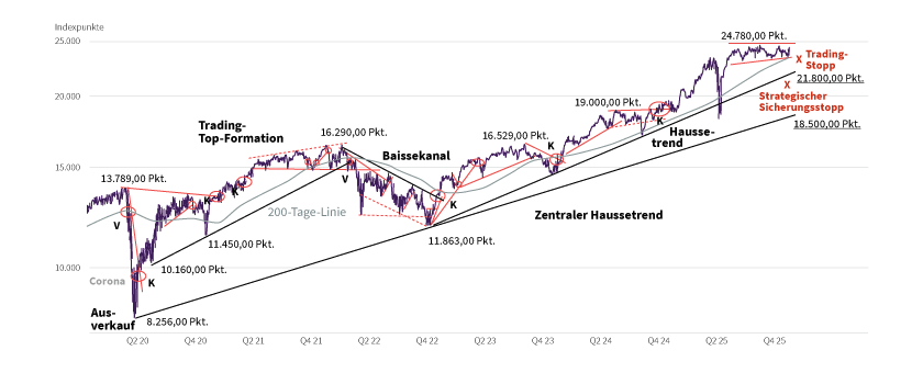 Der DAX befindet sich seit seinem Corona-Baissetief bei 8.256 Punkten (März 2020) in einer übergeordneten Haussebewegung, die bisher aus »normalen« mittelfristigen Haussetrends sowie einer Zwischenbaisse (im Jahr 2022) besteht. Die zentrale, gut fünfjährige Haussetrendlinie liegt derzeit bei 18.500 Punkten. Seit dem Zwischenbaissetief bei 11.863 Punkten (Oktober 2022) hat sich eine weitere mittelfristige Hausse mit der Haussetrendlinie bei 21.800 Punkten und damit unterhalb der steigenden 200-Tage-Linie (zurzeit bei 23.380 Punkten) herausgebildet. Als erste Konsequenz sollte als Teil des Risikomanagements ein strategischer Sicherungsstopp bei 21.800 Punkten positioniert werden. Dieser Stopp sollte dann parallel mit der steigenden Trendlinie Schritt für Schritt nachgezogen werden.